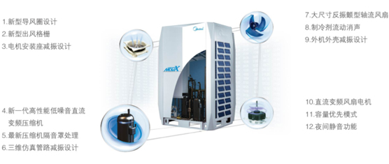 利用CFD、FEM等先進技術對空調(diào)系統(tǒng)的元器件振動源進行優(yōu)化,實現(xiàn)靜音運轉(zhuǎn),夜間運行模式把噪音降低到最低。